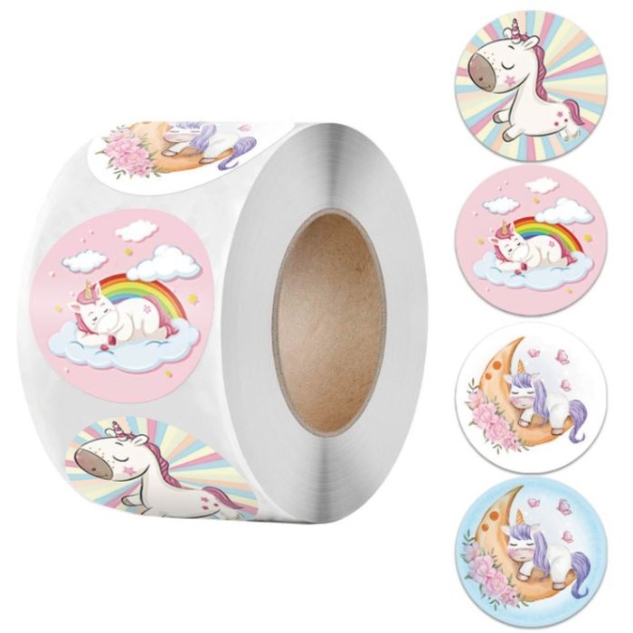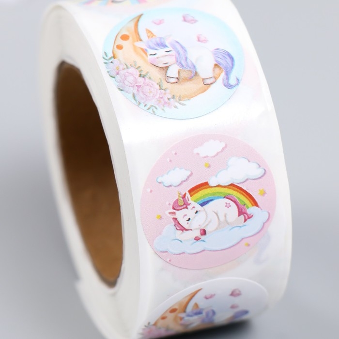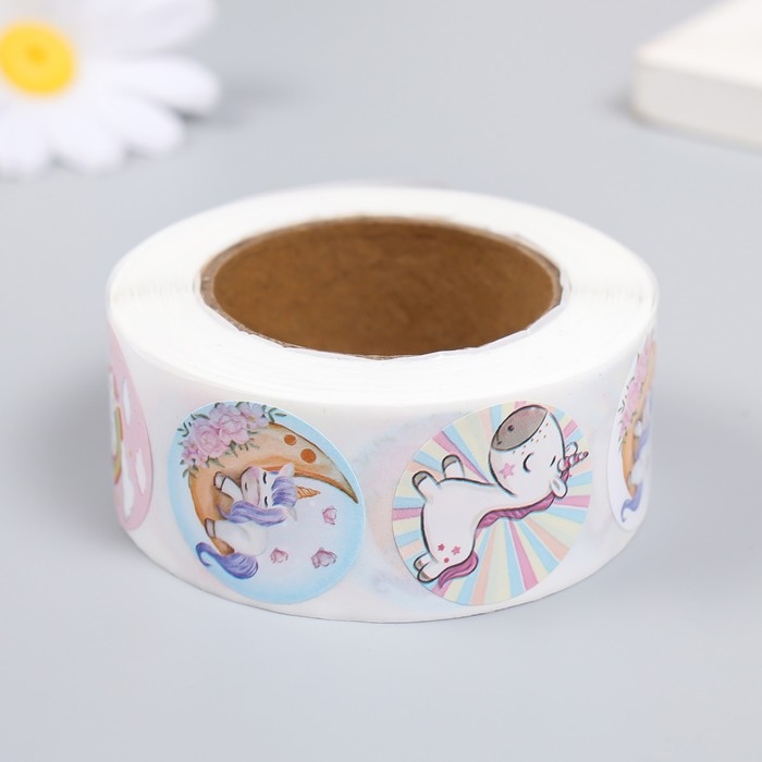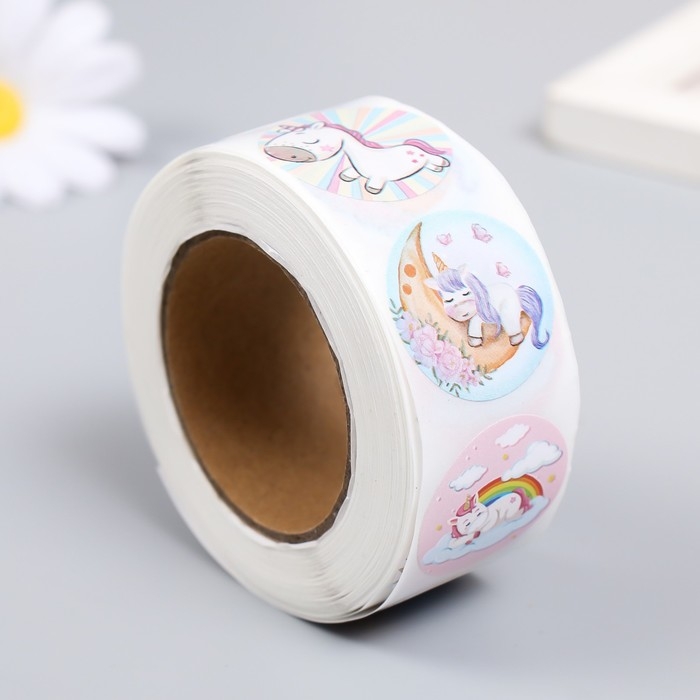 Наклейка бумага "Единорожки" d=2,5 см 500 шт в рулоне 3х6,5х6,5 см