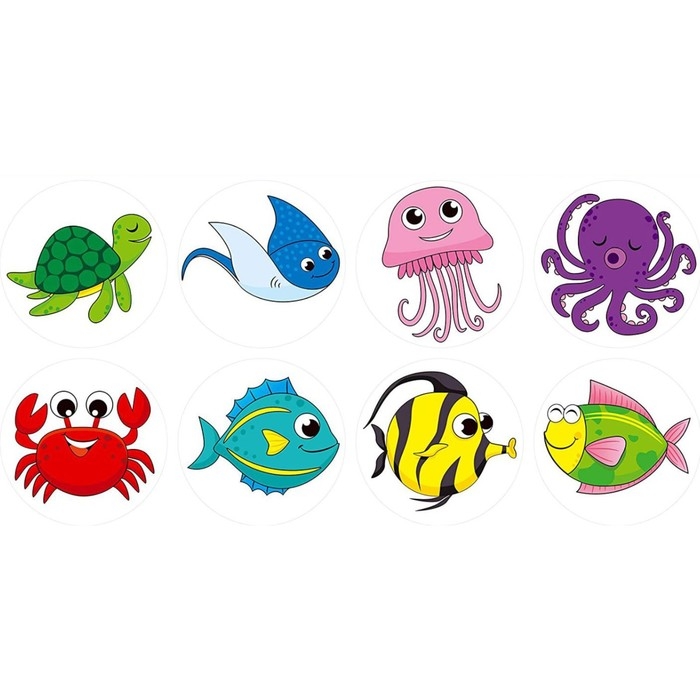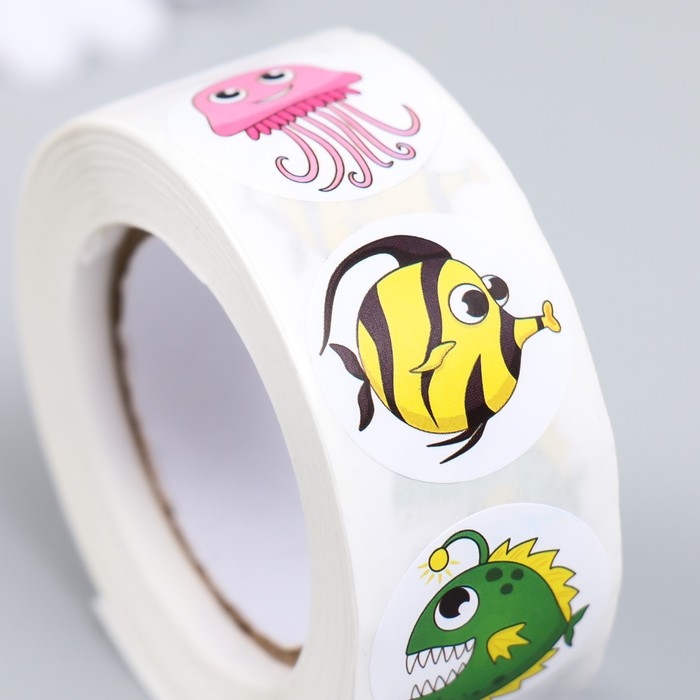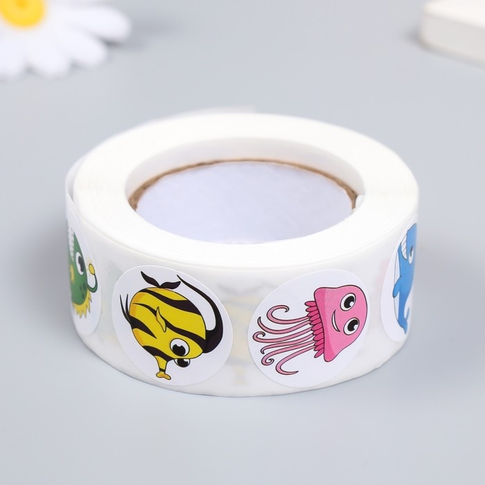 Наклейка бумага "Подводный мир" d=2,5 см 500 шт в рулоне 3х6,5х6,5 см