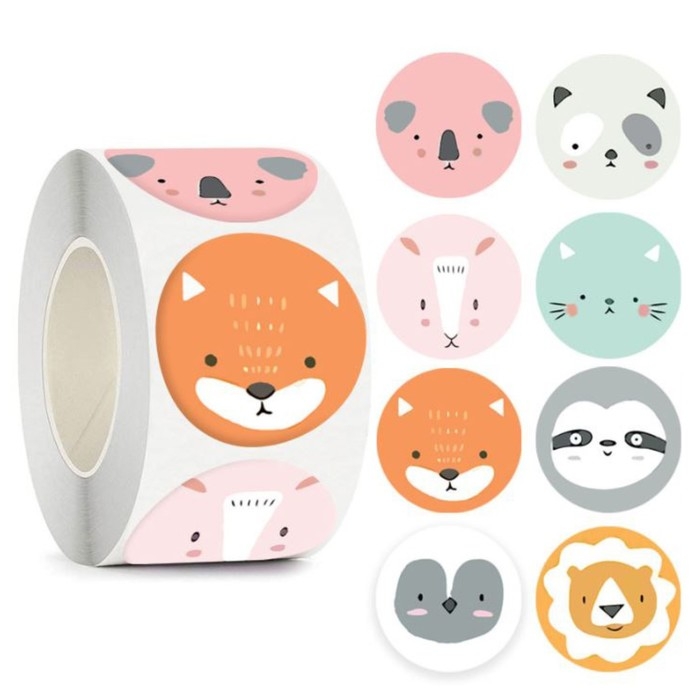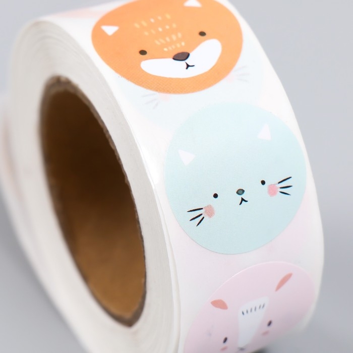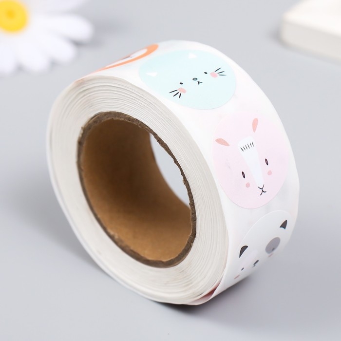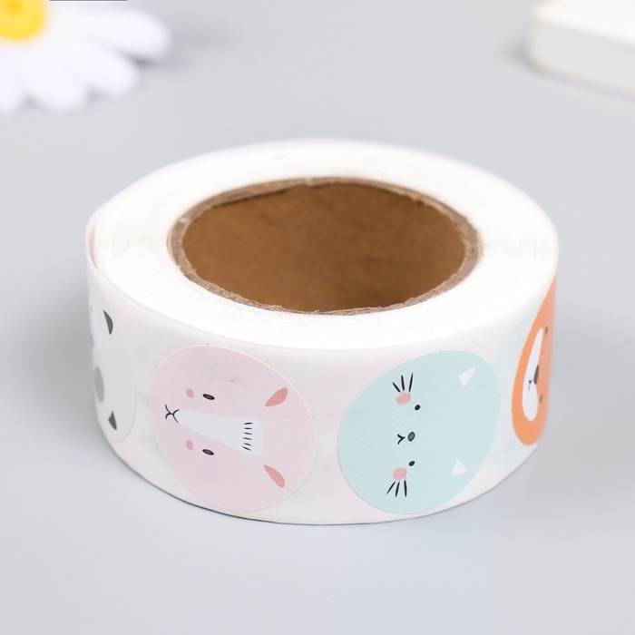 Наклейка бумага "Зверята - круглые мордочки" d=2,5 см 500 шт в рулоне 3х6,5х6,5 см