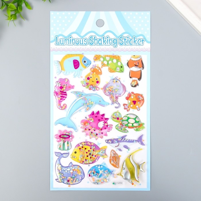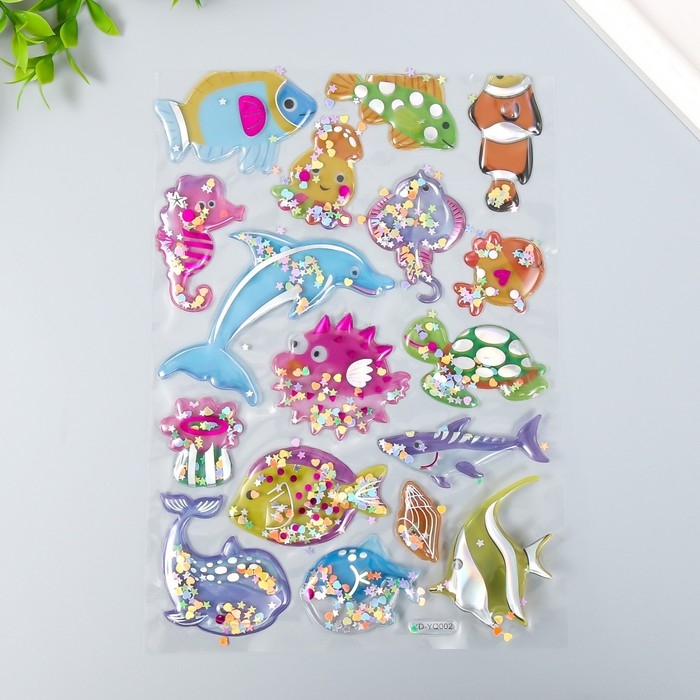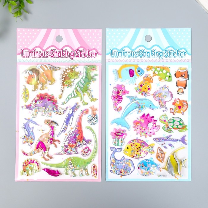 Наклейка пластик объёмные с глиттером "Динозавры/Рыбы" золото/серебро МИКС