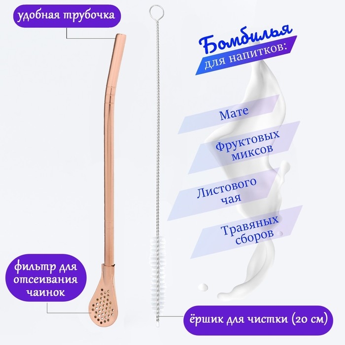 По традиции, аргентинский чай Йерба Мате пьют из специальных сосудов (калабаса) через трубочку с отверстиями для фильтрации мелкой фракции листа (бомбилья). Но в наши дни эта конструкция стала популярна так же для самых разных напитков: фитосборов, фруктовых и ягодных миксов, цветочного чая, каркаде, привычного листового чая и т.д. Бомбилья - отличная замена пластиковым трубочкам для любых коктейлей тем, кто заботится об окружающей среде.