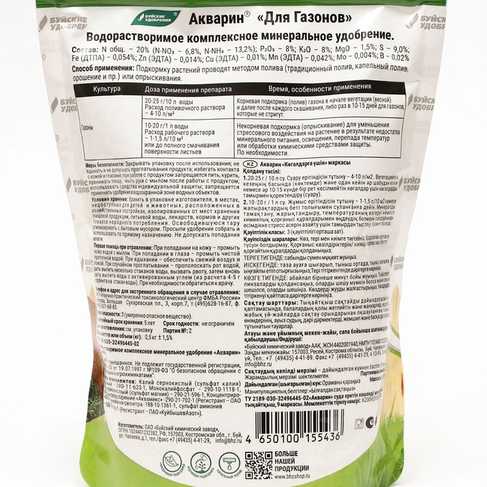Акварин для газонов - водорастворимое удобрение, в состав которого входит азот, фосфор, калий, магний, сера и микроэлементы – железо, цинк, марганец, медь в хелатной форме, а бор и молибден – в минеральной. Благодаря кислой реакции (рН) удобрения, оно легко растворяется в холодной воде и более эффективно усваивается корневой системой или листовой поверхностью растений.