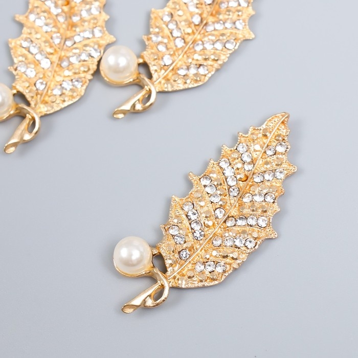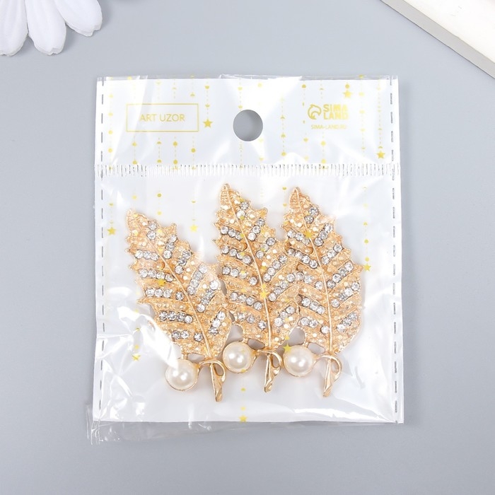 Декор для творчества металл, пластик "Листик с жемчужинкой и стразами" золото 5,5х2,2 см