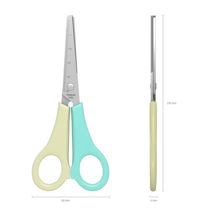 Ножницы с лезвиями из высококачественной нержавеющей стали с безопасными закругленными концами лезвий и линейкой, обеспечивающей точность резки. Не ржавеют. Ручки классической формы изготовлены из ударопрочного пластика.