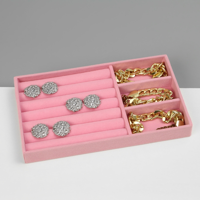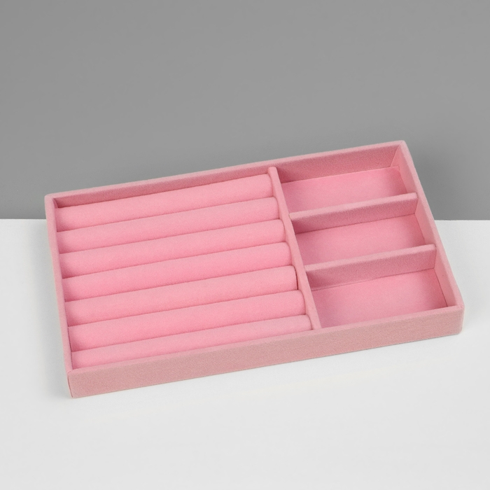 Подставка для украшения 3 ячейки и 6 полос для колец, флок, 21×12,3×2,5 см, цвет розовый