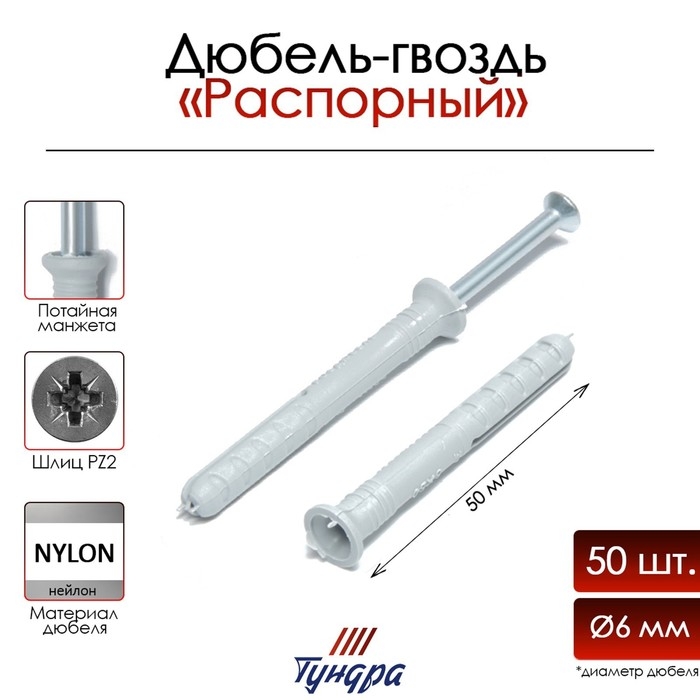 Дюбель-гвоздь "ТУНДРА", распорный, нейлоновый, потайная манжета, 6х50 мм, 50 шт