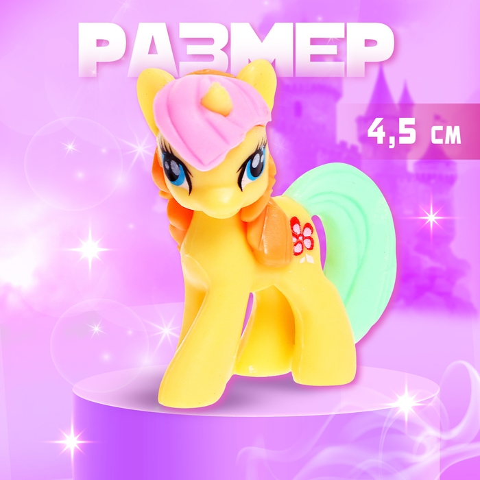 - Высота пони — 4,5 см. Игрушка очень компактная, поэтому её удобно захватить с собой на прогулку, в гости и даже в путешествие!
