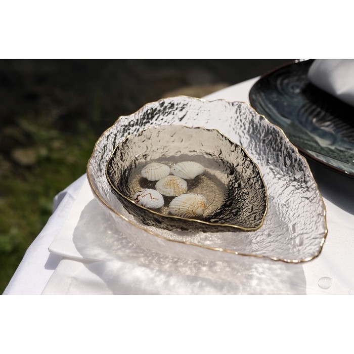 Салатник фигурный «Ракушка» изготовлен из рельефного стекла, имеет золотую отводку по краю. Такая посуда придётся по вкусу любителям оригинальных изделий. Салатник станет изюминкой вашего застолья и украсит праздничную сервировку.