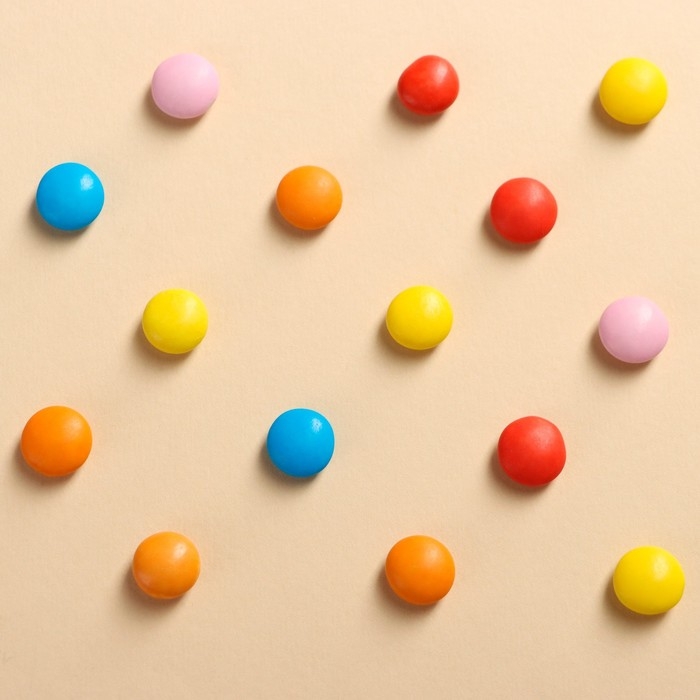 Состав: сахар, пальмовое масло, какао-порошок, кукурузный крахмал, сухое цельное молоко, стабилизатор (гуммиарабик), эмульгатор (соевый лецитин), глазирователь (карнаубский воск), ароматизаторы (ванилин, шоколад), красители (Е171, Е160а, Е150d, Е142, Е133, Е162, Е163, Е102, Е129).
