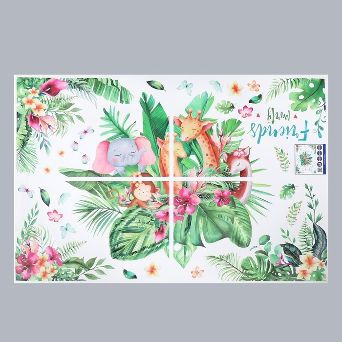 Наклейка пластик интерьерная цветная "Зверята спят в листьях" 60х90 см
