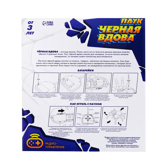 Паук работает от 4 батареек типа АА, пульт управления — от батарейки типа крона 9V.