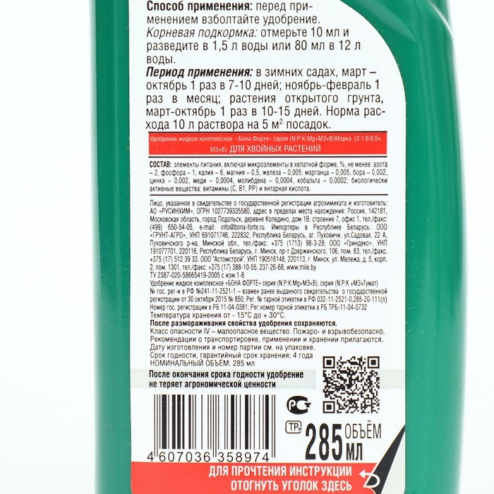 Жидкое водорастворимое минеральное удобрение для хвойных Bona Forte 285 мл используется для усиления декоративности и стимуляции роста елей, сосен, туи, пихты, можжевельника, кедра, кипариса, тиса, лиственницы.