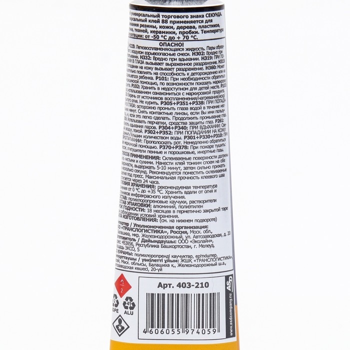 Универсальный клей Секунда 88 особо прочный водостойкий, 30мл 403-210 не содержит толуола.