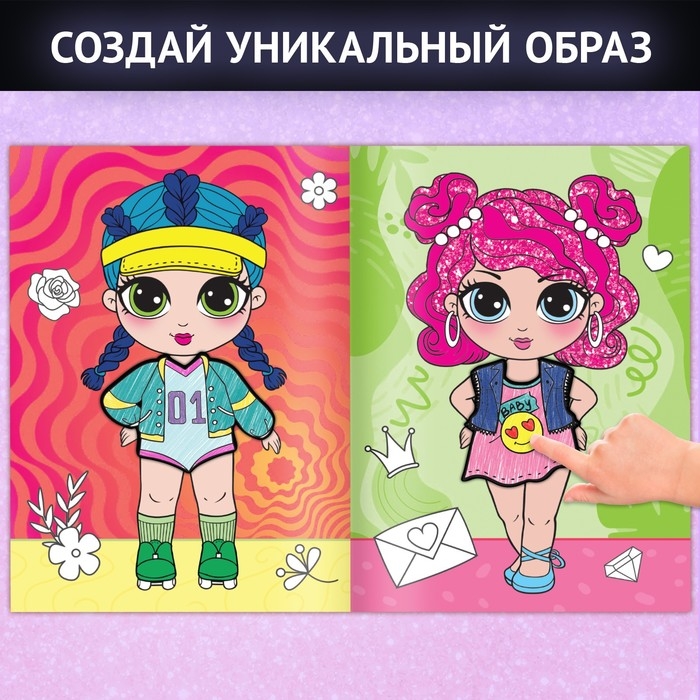 С такой книгой ребёнок сможет создать уникальную коллекцию стикеров! Нужно лишь разрисовать их на свой вкус карандашами или фломастерами. Готовые наклейки пригодятся для создания модного образа у кукол из книги.