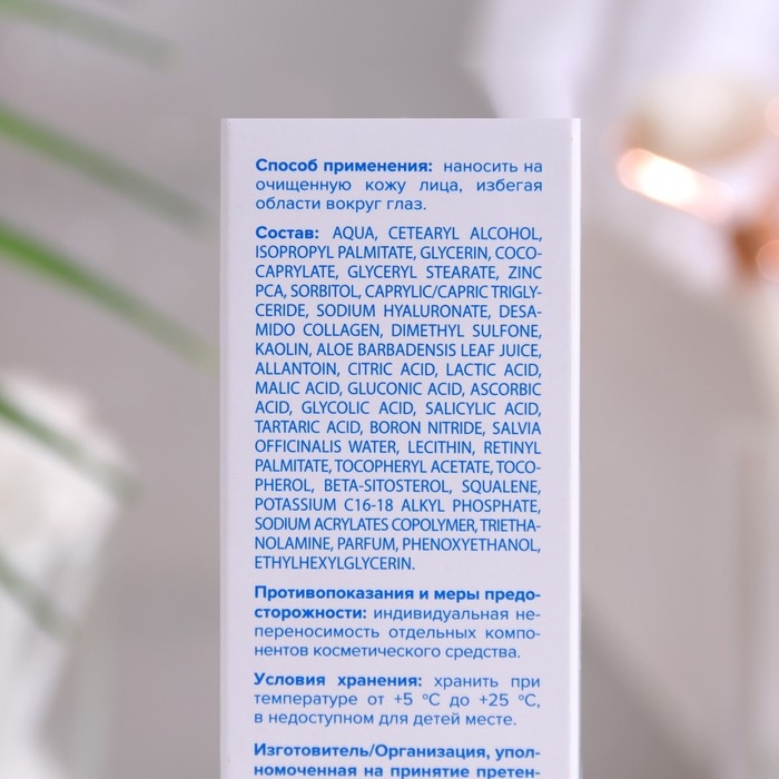 Состав: aqua, cetearyl alcohol, isopropyl palmitate, glycerin, coco-caprylate, glyceryl stearate, zinc PCA, sorbitol, caprylic/capric triglyceride, sodium hyaluronate, desamido collagen, dimethyl sulfone, kaolin, aloe barbadensis leaf juice, allantoin, citric acid, lactic acid, malic acid, gluconic acid, ascorbic acid, glycolic acid, salicylic acid, tartaric acid, boron nitride, salvia officinalis water, lecithin, retinyl palmitate, tocopheryl acetate, tocopherol, beta-sitosterol, squalene, potassium C16-18 alkyl phosphate, sodium acrylates copolymer, triethanolamine, parfum, phenoxyethanol, ethylhexylglycerin.
