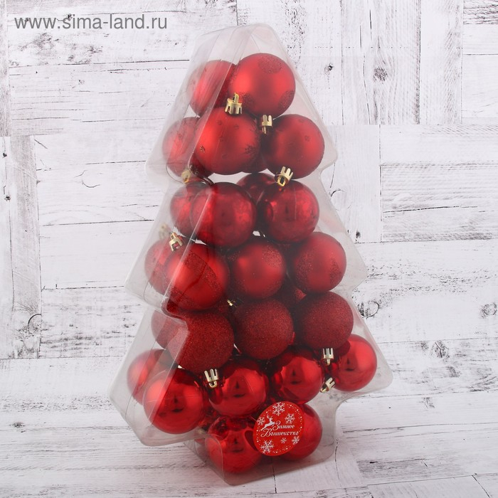 Набор шаров пластик d-5 см, 34 шт "Ёлочка - снежинки и горох" красный