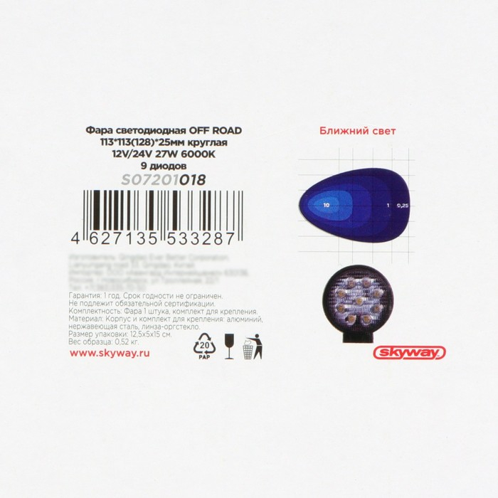 Фара светодиодная Skyway OFF ROAD, круглая, 12/24 В, 27 Вт, 6000 K, 9 диодов, 115 мм