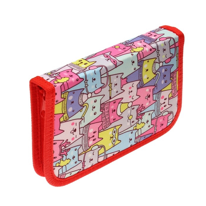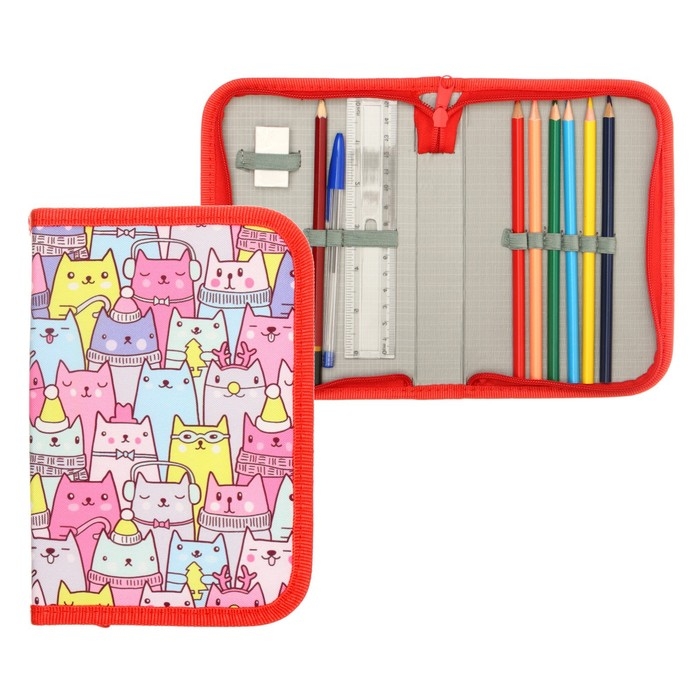 Пенал школьный "Котики", 13 х 19,5 см, на молнии, 1 секция, с наполнением, ткань