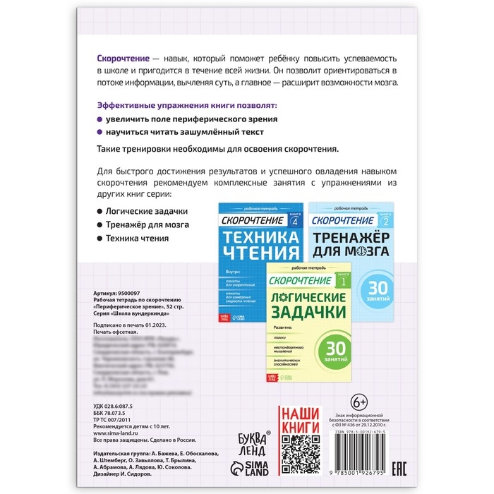 Чтобы успешно освоить скорочтение, важно увеличить поле периферического зрения и научиться читать зашумлённый текст. В этом помогут задания из рабочей тетради.