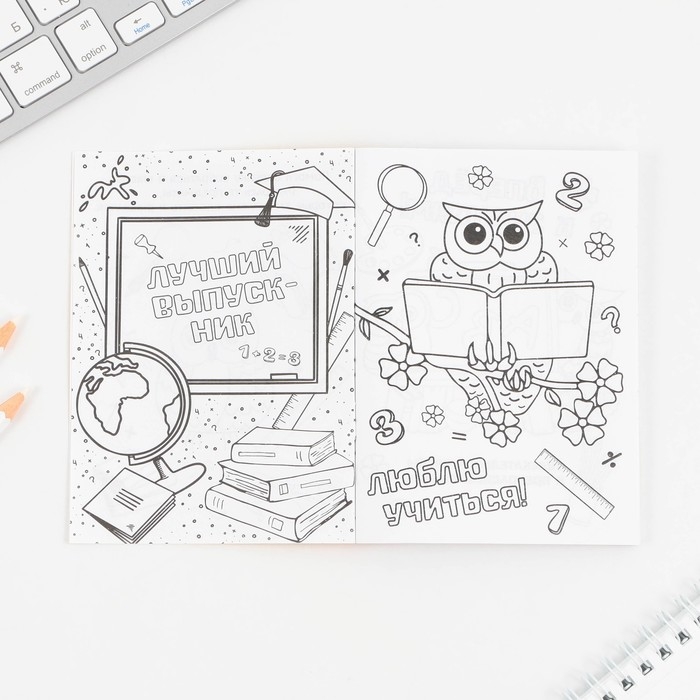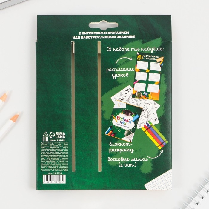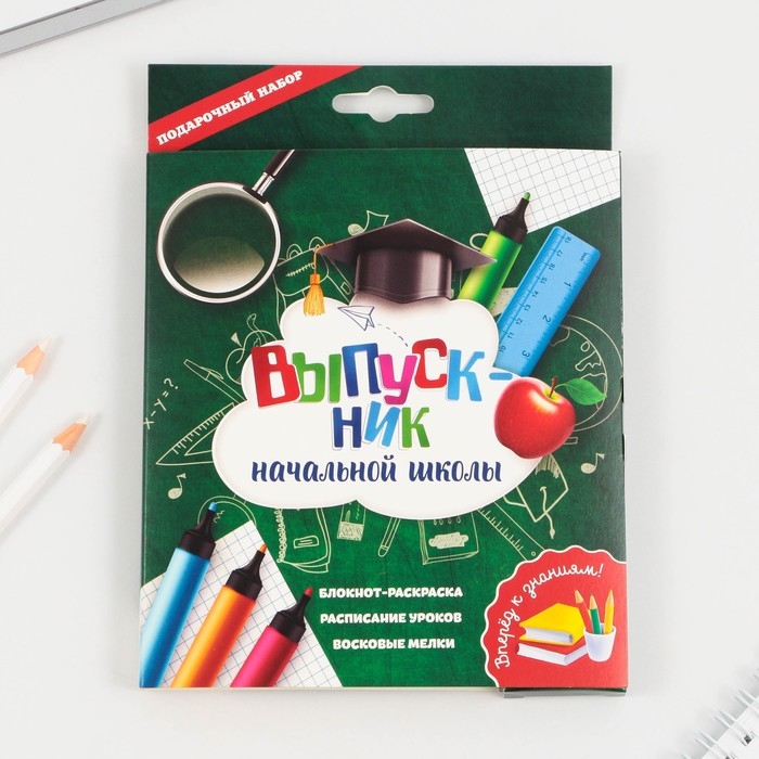 Подарочный набор на выпускной «ВЫПУСКНИК начальной школы» блокнот-раскраска, расписание уроков и восковые мелки 4 шт