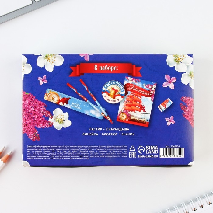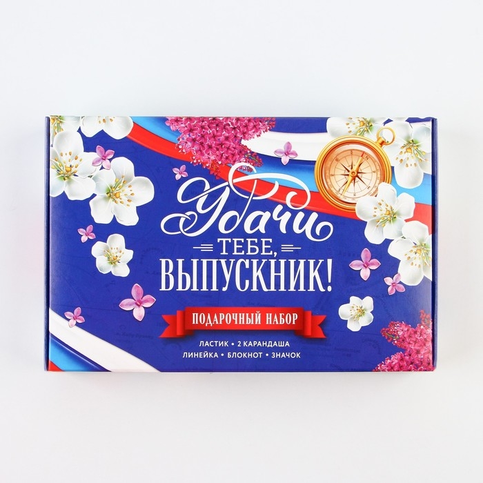 Подарочный набор на выпускной «Удачи тебе выпускник» блокнот,ластик, 2 карандаша HB, значок,линейка