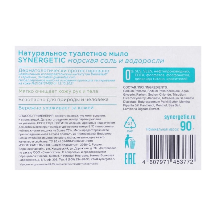 Натуральное кусковое туалетное мыло SYNERGETIC "Морская соль и водоросли" - средство для мягкого очищения и ухода за кожей, более чем на 99% состоящее из натуральных компонентов. Мыло имеет натуральную основу, изготовленную из растительных масел, которые бережно воздействуют на кожу, предохраняя от пересушивания при частом мытье рук. Натуральные эфирные масла и экстракты оказывают дополнительный уход и восстановление, а зелёные хелаты не наносят вред окружающей среде. Пантенол - незаменимый по эффективности компонент для защиты сухой и чувствительной кожи, он усиливает действие увлажняющих компонентов и способствует восстановлению барьерных функций. Парфюмерная композиция на основе натуральных эфирных масел эвкалипта, апельсина и пачули оставляет на коже освежающий аромат. Нанести на влажную кожу, вспенить и смыть водой. Только для наружного применения. Беречь от детей. При попадании средства в глаза промыть водой. Использовать строго по назначению. Aqua, Polyglyceryl-3 Cetyl Ether Olivate/Succinate, Vitis Vinifera (Grape) Seed Oil, Cocos Nucifera Oil, Coco-Caprylate/Caprate, Isoamyl Laurate, Propanediol, Glycerin, Betaine, Niacinamide, Trehalose, Sodium Hyaluronate, Tocopheryl Acetate, Xanthan Gum, Behenyl Alcohol, Glyceryl Stearate, Saccharide Isomerate, Oryza Sativa (Rice) Starch, Parfum, Benzyl Alcohol, Glyceryl Laurate, Lactic Acid, Citric Acid, Sodium Citrate.