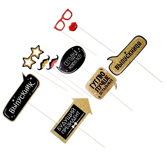 - В наборе 5 надписей для крутых фото, 2 пары очков, 2 пары усов и губы. Данные элементы нужно закрепить на палочки из комплекта.