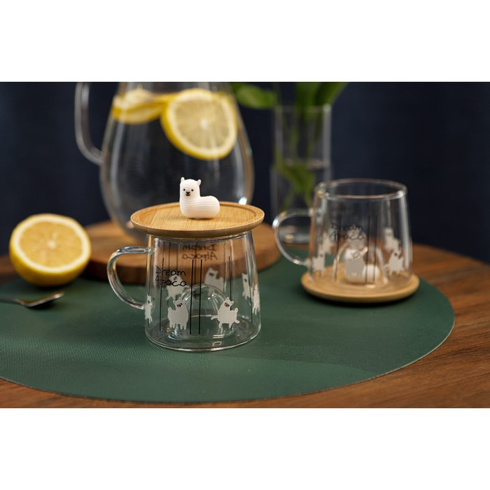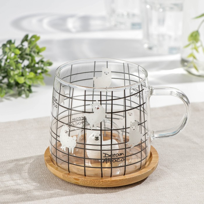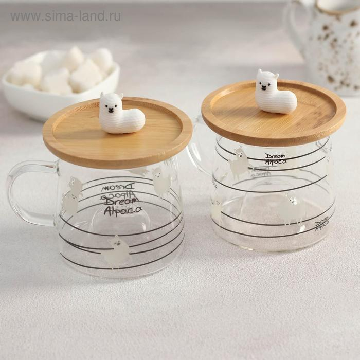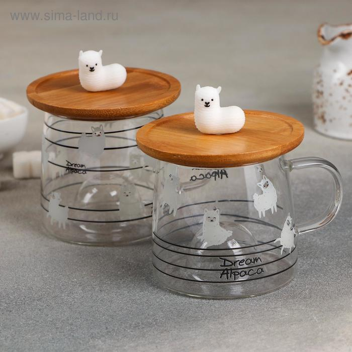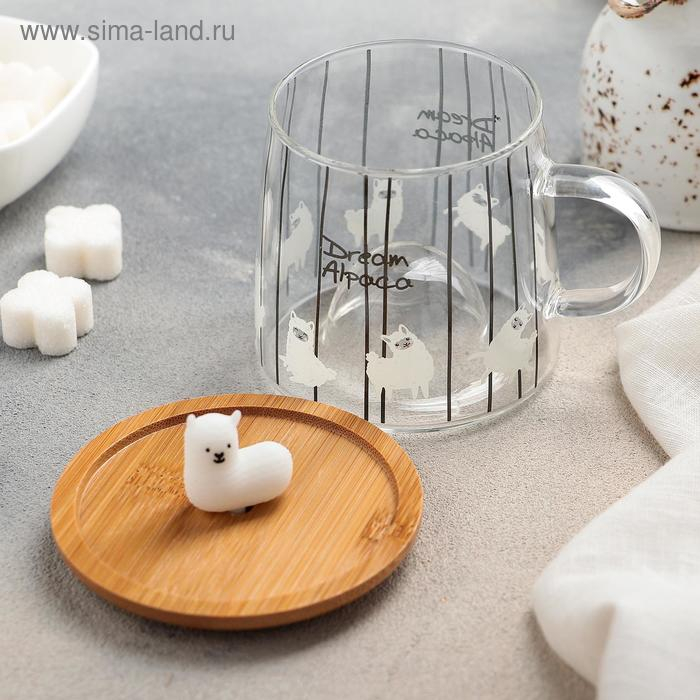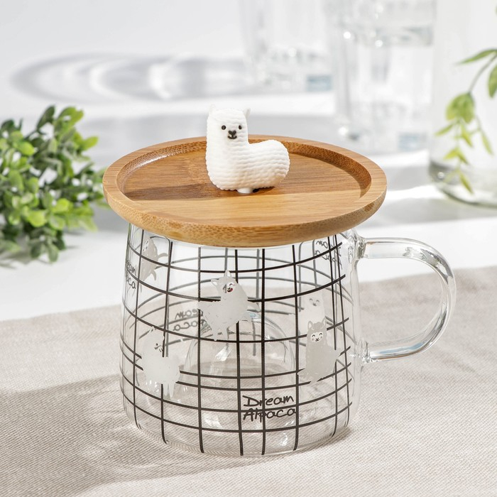 Кружка стеклянная с деревянной крышкой «Лама», 300 мл, рисунок МИКС