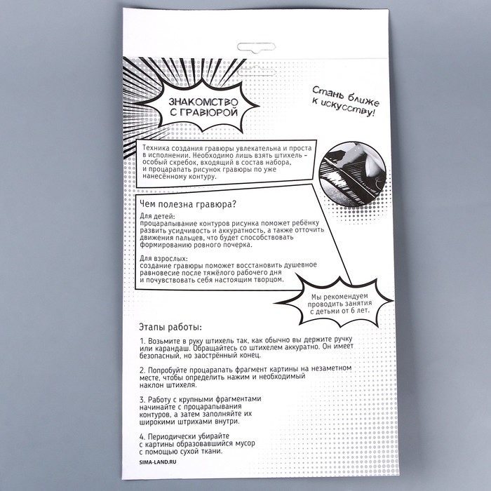 Чтобы создать невероятно красивую гравюру, достаточно процарапать намеченные контуры рисунка специальным инструментом — штихелем. И дети и взрослые будут с удовольствием соскребать верхний слой гравюры с контуров будущей картины, под которым находится сверкающая фольга!