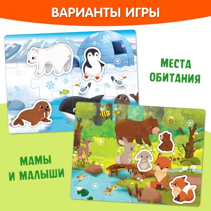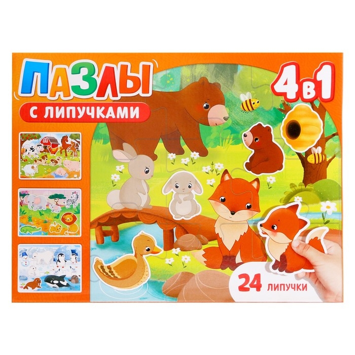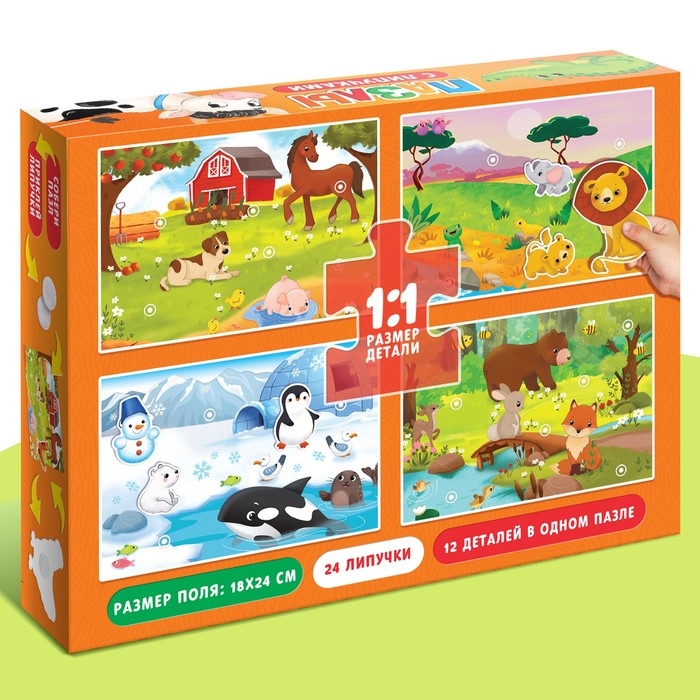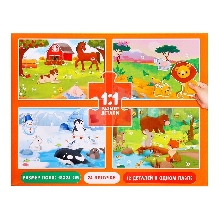 Пазлы с липучками 4 в 1 «Где живут зверята?», 4 пазла, 24 фигурки, 24 липучки, по 12 деталей
