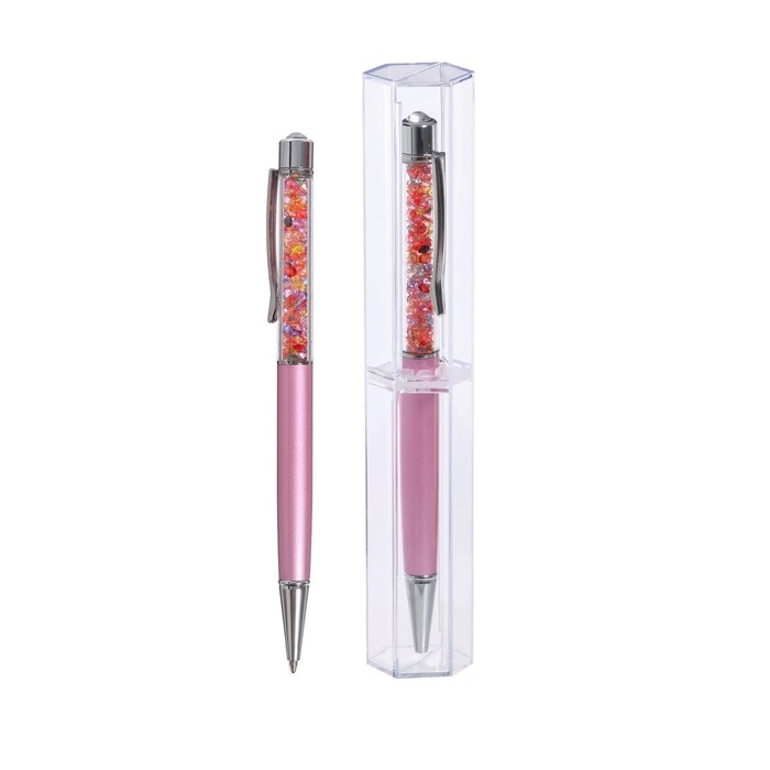 Ручка подарочная шариковая в пластиковом футляре поворотная Стразы розовая с серебром