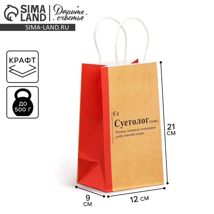 Упаковка, пакет подарочный крафтовый, «Суетолог», 12 х 21 х 9 см