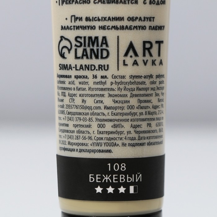 Акриловая краска,цвет бежевый, № 108 в тубе, матовая 36 мл