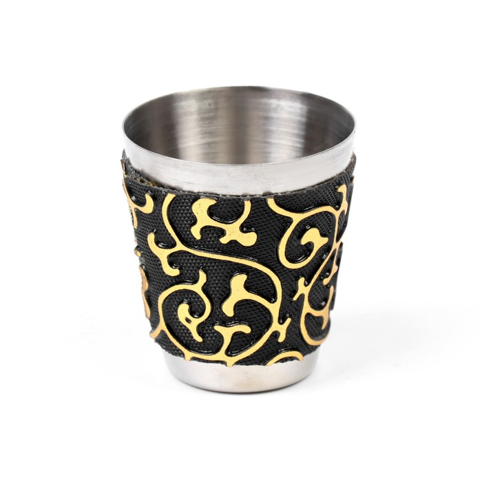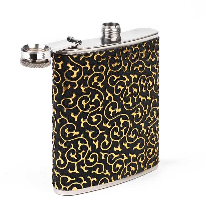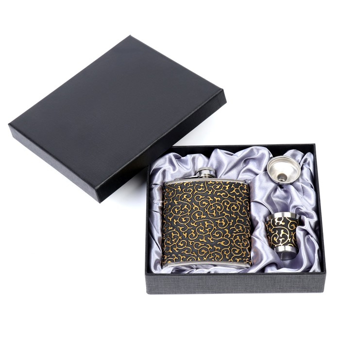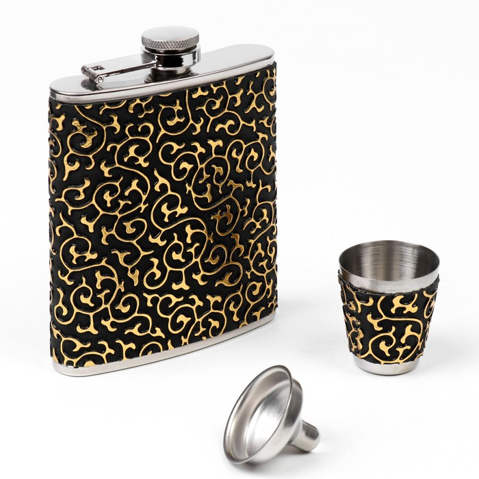 Подарочный набор 3 в 1 "Завитки", чёрный с золотистым узором: фляжка 210 мл + воронка и рюмка