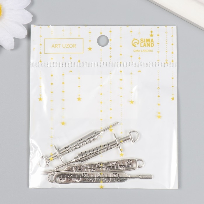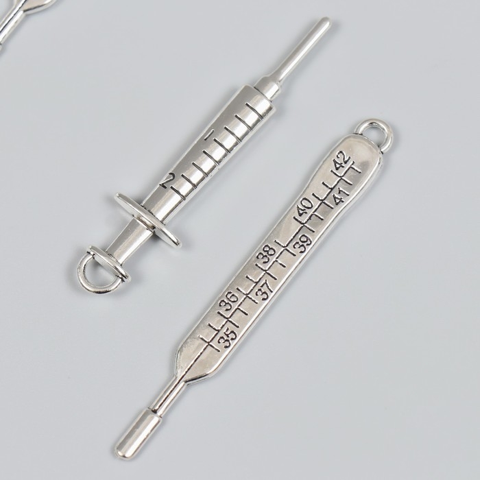 Декор для творчества металл "Градусник и шприц" серебро набор 2 шт 7,1х0,9 см