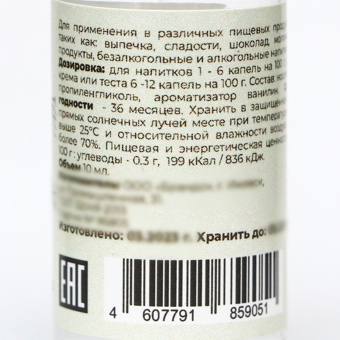 Дозировка: для напитков 1-6 капель на 100 грамм, для крема или теста 6-12 капель на 100 грамм.