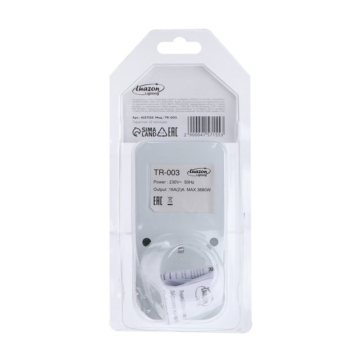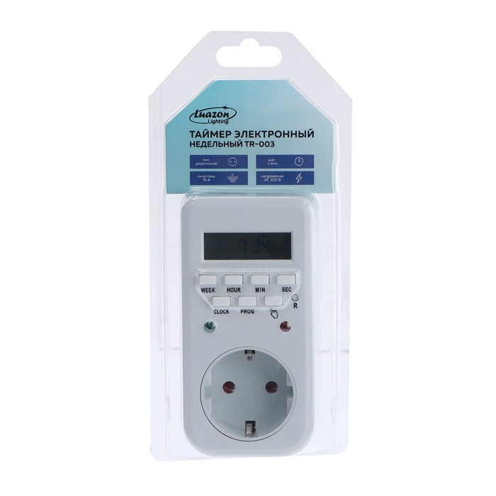 Розеточный электронный таймер Luazon Lighting недельный, 16A, шаг 1 мин, 220 В можно использовать в системе «Умный дом». Модель оптимальна для контролирования включения устройств через определенные промежутки времени. Устройство имеет специальную вилку для подсоединения к сети электропитания посредством стандартной розетки. Для комфортного управления настройками на таймере есть кнопки и условные обозначения. Специальный разъем можно применять для подключения совместимых устройств. Модель с прочным пластиковым корпусом из износостойкого пластика не подвержена преждевременному износу, механическим повреждениям, трещинам и сколам. Поверхность можно протирать сухой салфеткой из мягкой ткани.
