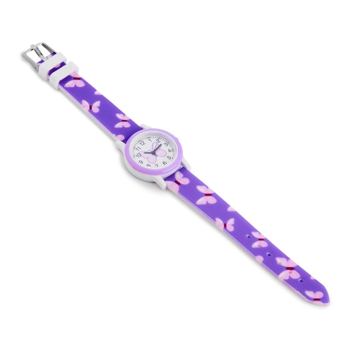 Яркие детские наручные часы - модный аксессуар для девочек с важным функциональным предназначением. Благодаря наличию такого типа часов ребенок научится распознавать время и планировать свои дела. Циферблат на фоне бабочек однозначно заинтересует любую девочку.