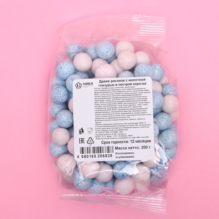 Драже рисовое в пестрой глазури - это вкусный и хрустящий десертный продукт, который представляет собой небольшие шарики из рисовых зерен, покрытых сладкой белой глазурью. Они имеют приятный вкус и аромат, который напоминает сладкий рисовый пудинг.