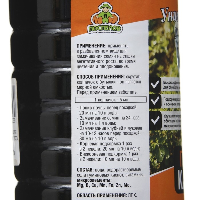 Гумат калия— универсальное жидкое органическое удобрение, предназначено для садово-огородных культур. Используется для обработки семян, черенков и клубней, корневой и внекорневой подкормки.