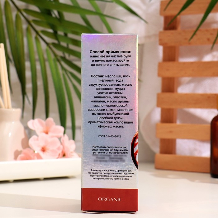 Состав: масло ши, воск пчелиный, вода структурированная, масло кокосовое, муцин улитки ахатины, аллантоин, эластин, коллаген, масло арганы, масло черноморской водоросли камки, масляная вытяжка тамбуканской целебной грязи, ароматическая композиция эфирных масел. Применение: Нанесите на чистые руки и нежно помассируйте до полного впитывания.