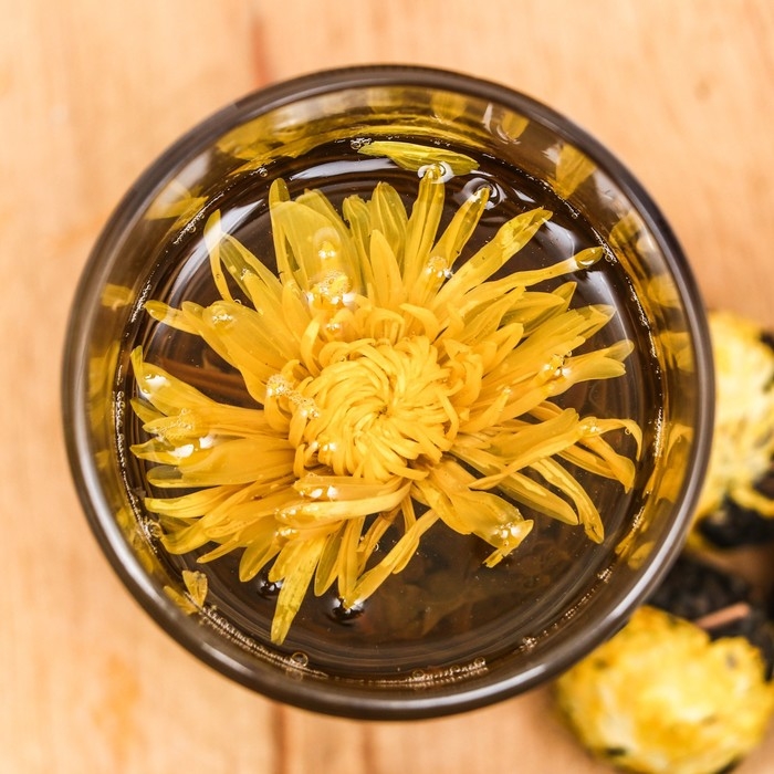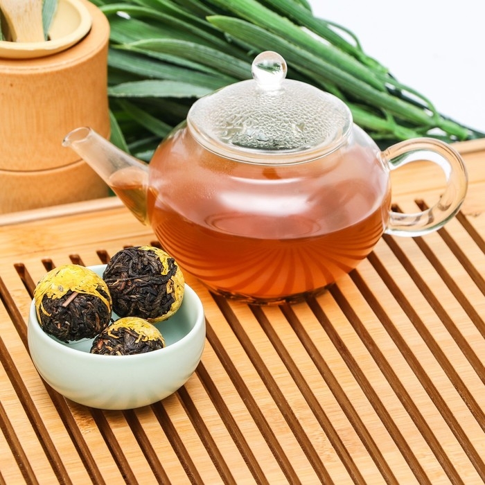 Связанный чай создан для тех, кто любит наслаждаться ароматом чая. Сухой шарик источает густой медовый аромат клевера. Настой сохраняет в себе лишь отголосок этого запаха на фоне ароматов хризантемы. Раскрываясь, выпускает гроздь лепестков, основанием которой служит желтая хризантема. Очень красивое зрелище, которым лучше всего любоваться, заварив этот чай в жаропрочном стеклянном чайнике. Настой светлый, желтоватый, с едва различимым зеленоватым оттенком. Вкус зелёного чая в нём сочетается с нежным, словно тающим на языке цветком, изящно дополняющими букет. Заваривать при температуре 80-85 °C, 1 штука на чайник 450 мл.