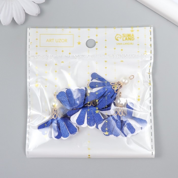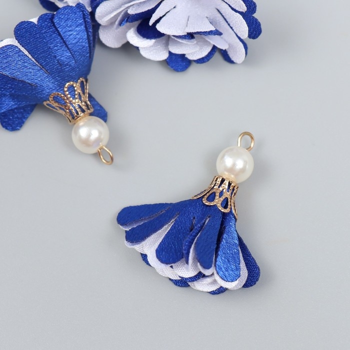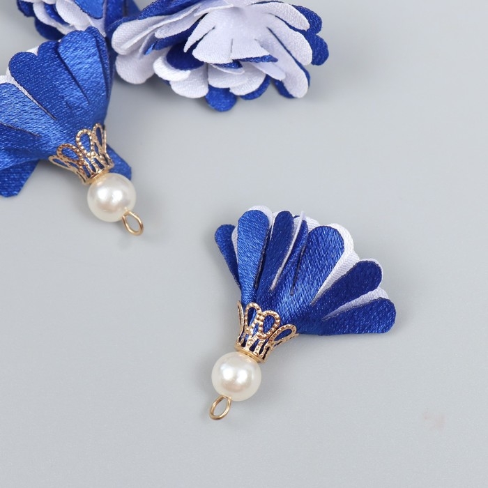 Декор текстиль "Цветок 2 цвета с жемчужиной. Ультрамарин и белый" набор 6 шт 3 см