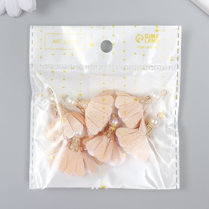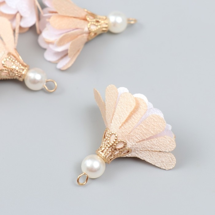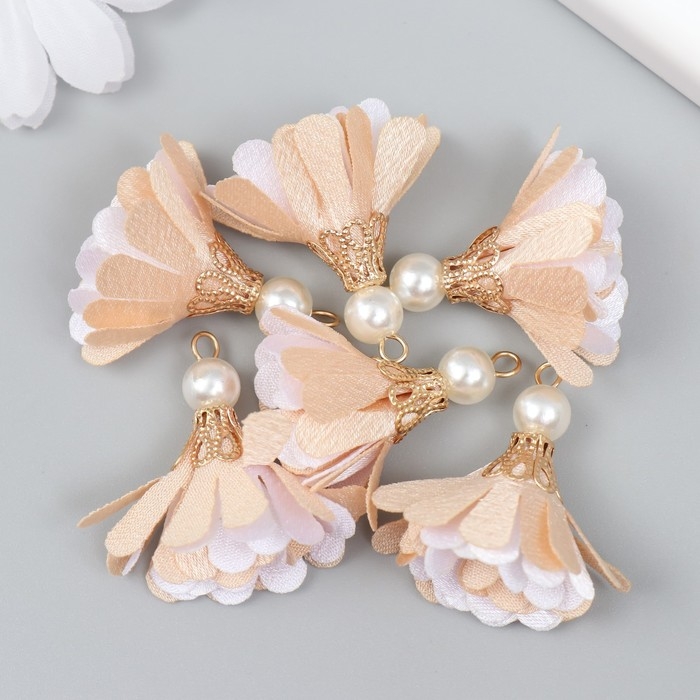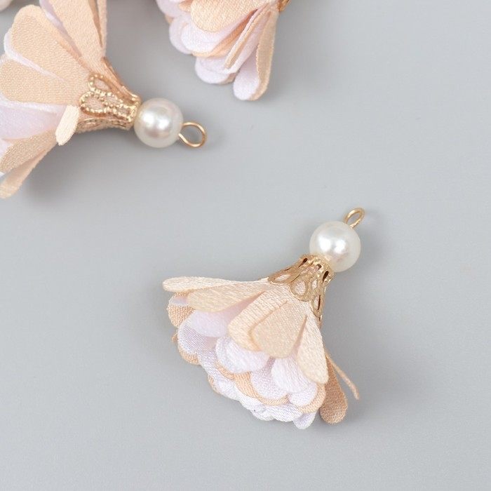 Декор текстиль "Цветок 2 цвета с жемчужиной. Телесный и белый" набор 6 шт 3 см