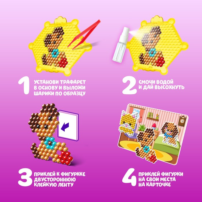 С аквамозаикой от торговой марки «Эврики» ребёнок соберёт объёмные фигурку из цветных бусинок. Детали плотно скрепляются друг с другом. Из бисера можно сделать интересную аппликацию на красочном фоне.