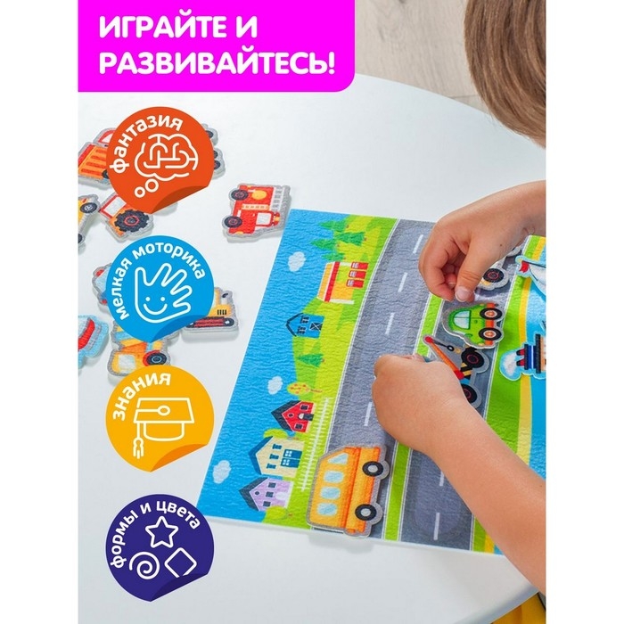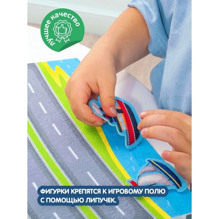 Игровой набор «Транспорт» — это многофункциональная игрушка для проведения сюжетно-ролевых игр, знакомства с окружающим миром и цветами. Фигурки крепятся к игровому полю с помощью липучек. Машинки могут перемещаться по фетровым дорогам, прикрепляясь к локациям. Познакомьте малыша с разнообразием машин!