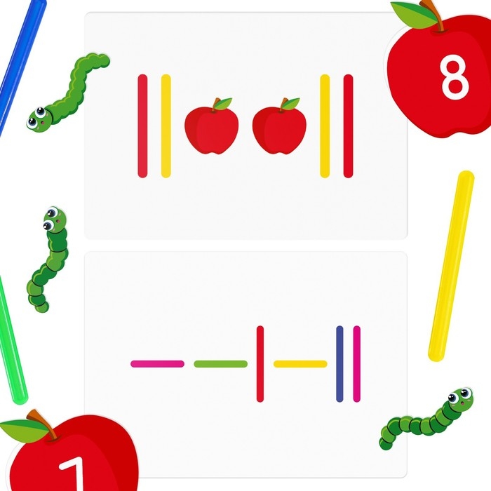 Выложите перед ребёнком яблоко стороной с цифрой вверх. Задача ребёнка – выложить рядом с яблоком такое количество счётных палочек любого цвета, какое число написано на яблоке. Не забывайте спрашивать ребёнка, какое число написано на яблоке и сколько палочек нужно выложить.