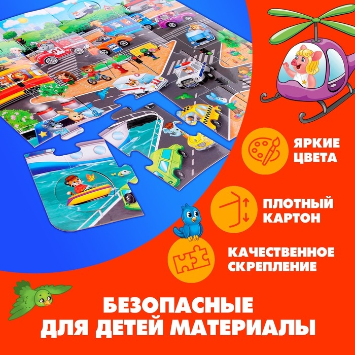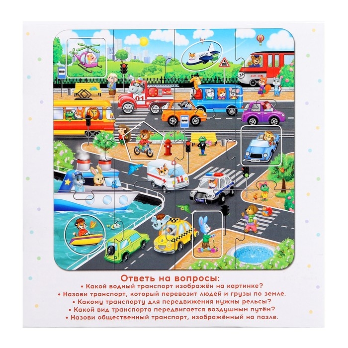 С такой игрой ребёнок познакомится с разными видами транспорта и научится находить связь между частью и целым. Крупные детали пазла с картонными вкладышами способствуют развитию визуально-пространственного интеллекта, а также мелкой моторики и сенсорики.