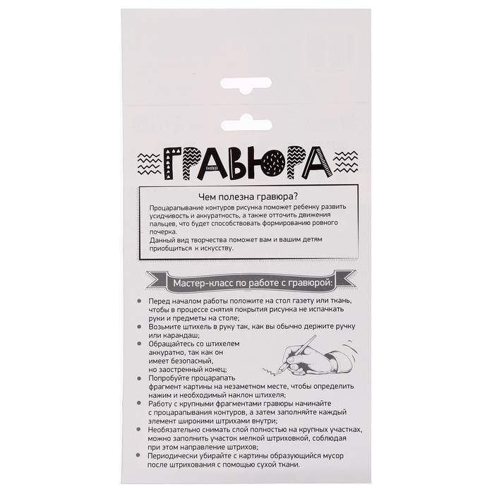 Набор для творчества поможет приобщиться к старинному виду творчества — гравюре, а также раскрасить объёмную картинку. За занятием дети разовьют усидчивость и аккуратность, отточат движения пальцев и подготовят руку к письму. А для взрослых такое творчество поможет восстановить душевное равновесие после тяжёлого рабочего дня и почувствовать себя настоящим художником.
