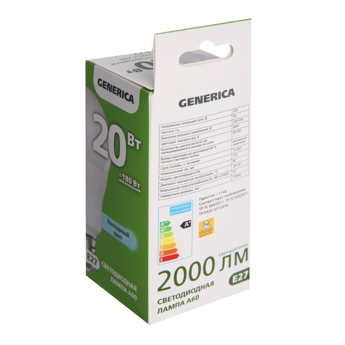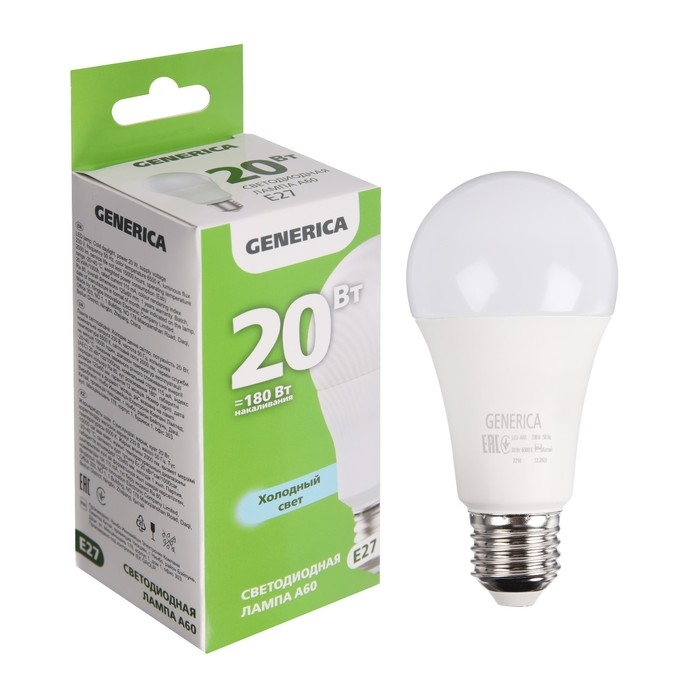 Лампа светодиодная GENERICA A60, 20 Вт, груша, 6500 К, E27, 230 В, LL-A60-20-230-65-E27-G